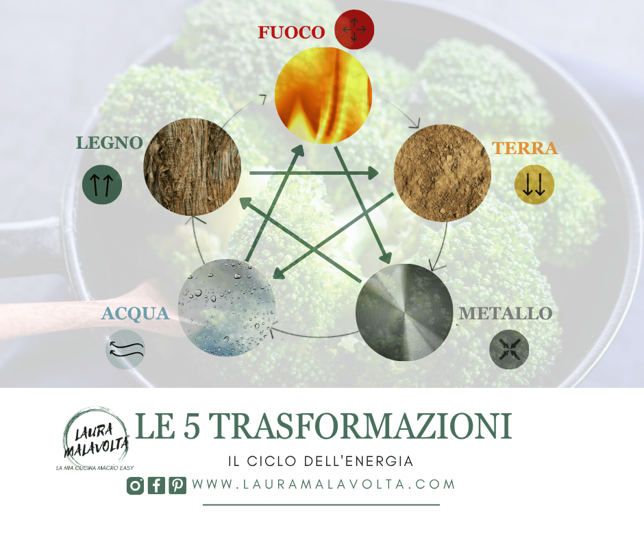 Il movimento e la trasformazione continua di Yin e Yang si manifesta nel Ciclo delle 5 Trasformazioni, conosciuto anche come i 5 Elementi — Acqua, Legno, Fuoco, Terra e Metallo — che mostrano come questo movimento e il nostro corpo siano in costante relazione con l’ambiente e il clima. Ognuna di queste cinque energie è legata a un periodo dell’anno, a una stagione — che, secondo la macrobiotica, sono cinque — a specifici organi e stati d’animo. Qui una breve introduzione ai 5 Elementi:
